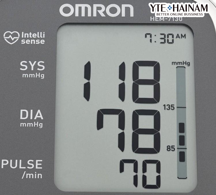👉 Máy đo huyết áp bắp tay sử dụng công nghệ Intellisense mới tự động hoàn toàn giúp đo huyết áp đơn giản, nhanh chóng. Khi kiểm tra huyết áp với máy đo huyết áp Omron HEM-7130 màn hình hiển thị các thông số huyết áp tối đa, huyết áp tối thiểu và nhịp tim dễ đọc cùng với cột biểu đồ cảnh báo mức an toàn của huyết áp người đo.
