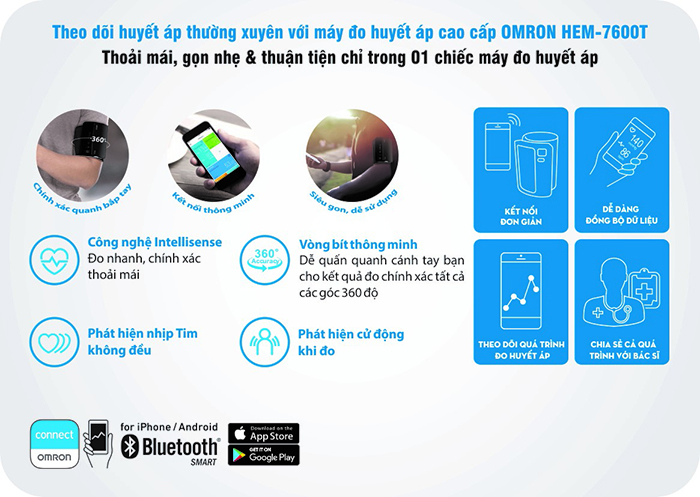 Với Omron Connect bạn sẽ có một cái nhìn thật rõ ràng về sức khoẻ huyết áp của bạn mọi lúc mọi nơi. Máy được kết nối không dây và đồng bộ dữ liệu của bạn thông qua Bluetooth và bạn có thể dễ dàng tải lên App, lưu trữ và xem dữ liệu về huyết áp , kết quả sẽ được gửi tới bác sĩ hoặc gia đình của bạn. Ứng dụng cũng cho phép bạn theo dõi trọng lượng để có thể dễ dàng đạt được các mục tiêu về sức khoẻ của mình .