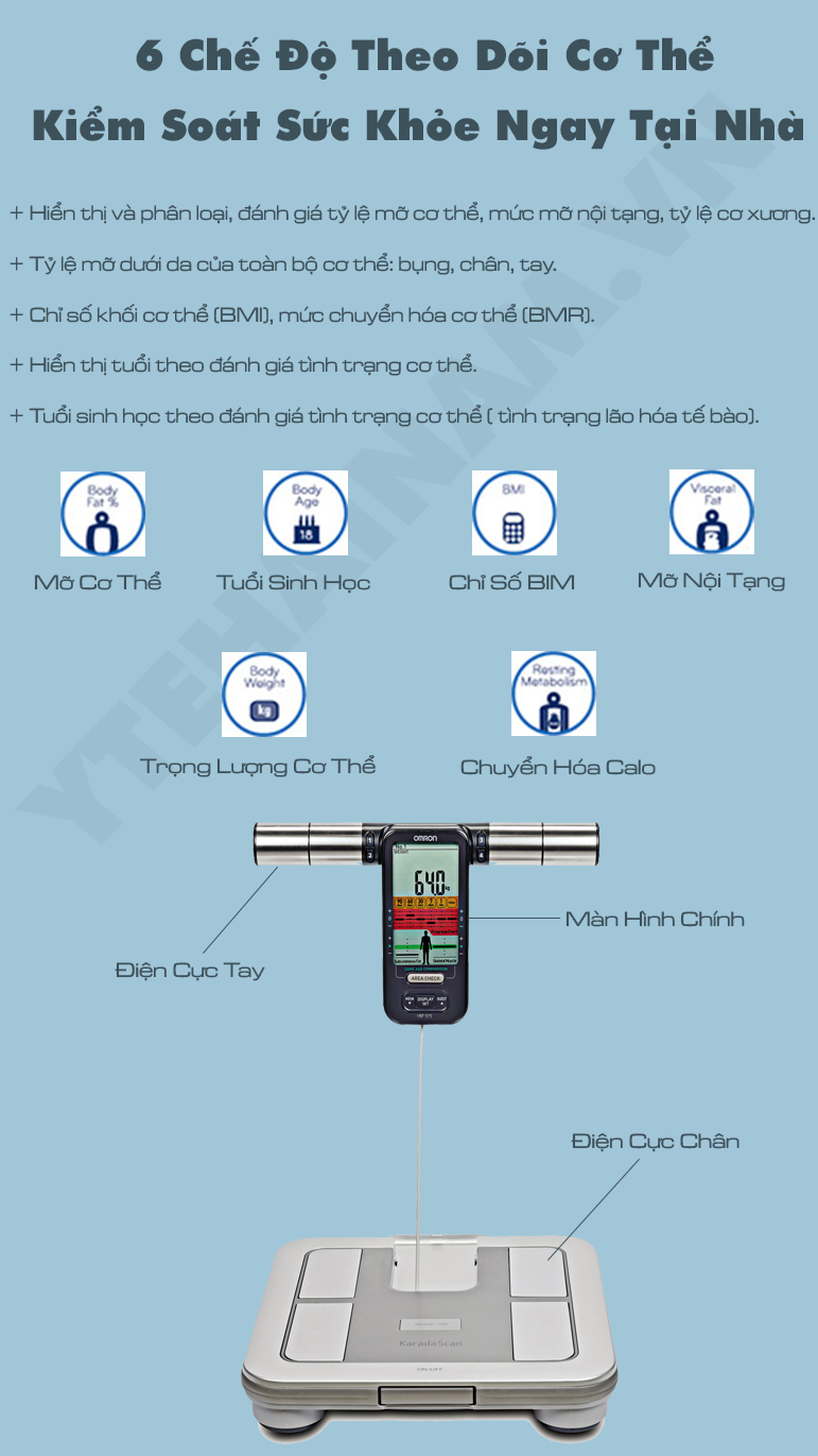 OMRON HBF-375 sử dụng phương pháp kháng trở để đo sức để kháng cho cơ thể bằng cách sử dụng dòng điện yếu chạy qua cả 2 tay và 2 chân.