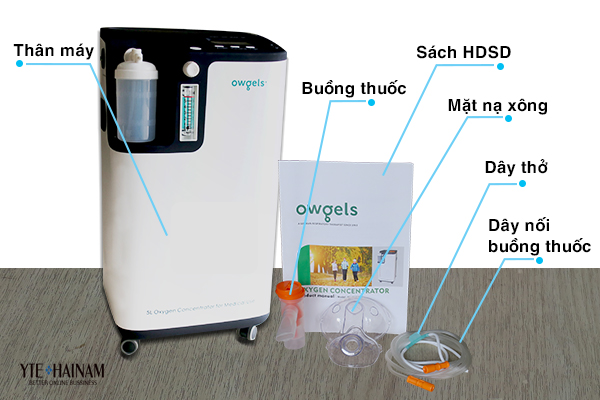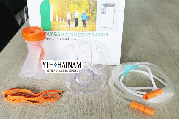 Máy tạo oxy, mặt nạ thở, dây thở, dây nối buồng thuốc, bình tạo ẩm, 2 bộ lọc (bộ lọc thô, bộ lọc đầu vào oxy), sách hướng dẫn sử dụng.