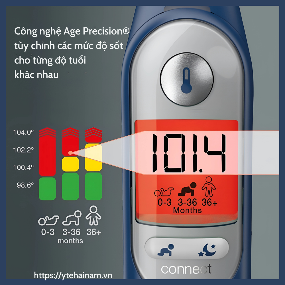 Máy đo chỉ mất đúng 1 giây, bé ngủ vẫn đo được mà không quấy khóc. Đặc biệt, chức năng Age Precision rất tiện: chỉ cần chọn đúng độ tuổi, máy sẽ tự cảnh báo sốt bằng màu sắc (xanh – vàng – đỏ), dễ theo dõi hơn nhiều so với kiểu hiển thị số khô khan.