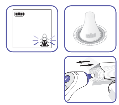 3. Nếu bạn chưa gắn đầu bọc mũi nhiệt kế vào máy thì trên màn hình sẽ xuất hiện cảnh báo nhắc bạn. Nhiệt kế chỉ hoạt động khi đầu bọc mũi nhiệt kế được gắn đúng vào máy. Để có kết quả đo chính xác, bạn nên dùng một đầu bọc mũi nhiệt kế mới, sạch cho mỗi lần đo
