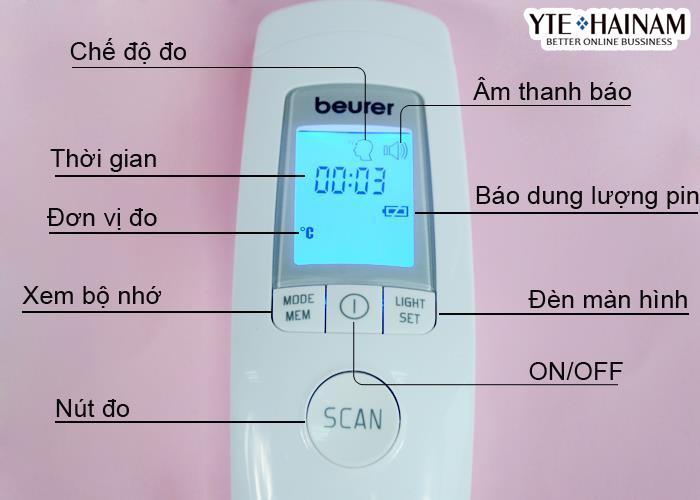 Các nút ấn trên nhiệt kế điện tử đo trán Beurer FT90